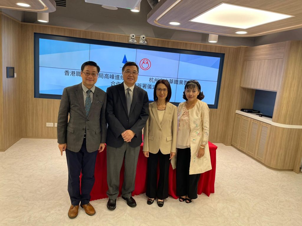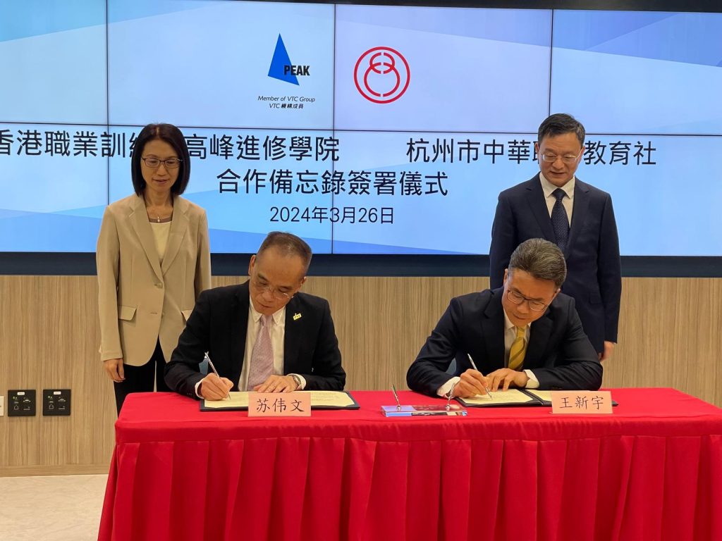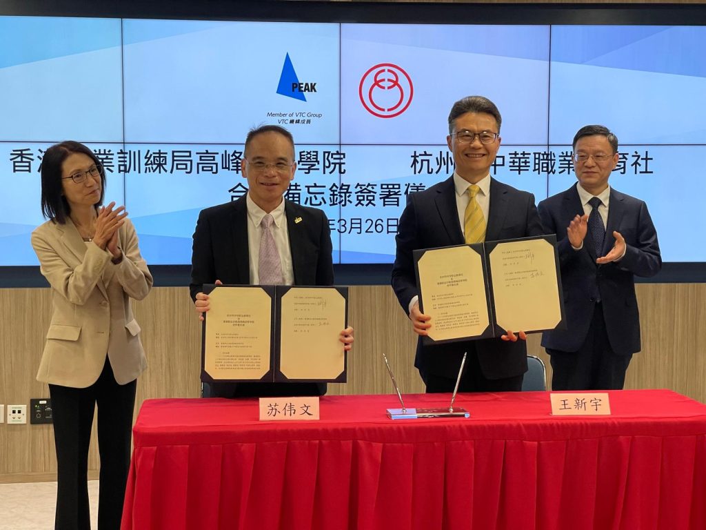 職業專才教育是香港教育體系中的重要部分。政府亦一直支持職業訓練局(VTC) 立足香港,胸懷國家,放眼世界。為深化香港與內地合作推廣職業專才教育,香港職業訓練局高峰進修學院 (PEAK) 於3月26日與杭州市中華職業教育社簽署合作備忘錄。透過是次合作建立杭港職業教育教師培訓平臺,並於加強職業教育有關方面建立緊密夥伴關係,根據杭港兩地職業教育發展需要,充分發揮各自領域的優勢,攜手為職業專才教育揭開新的裏程碑。出席簽署儀式的嘉賓包括職業訓練局助理執行幹事任影嬋女士、高峰進修學院院長蘇偉文教授;杭州市委常委、統戰部部長朱建明先生、杭州市委統戰部副部長王新宇先生及香港中華職教社主席黃玉山教授等。